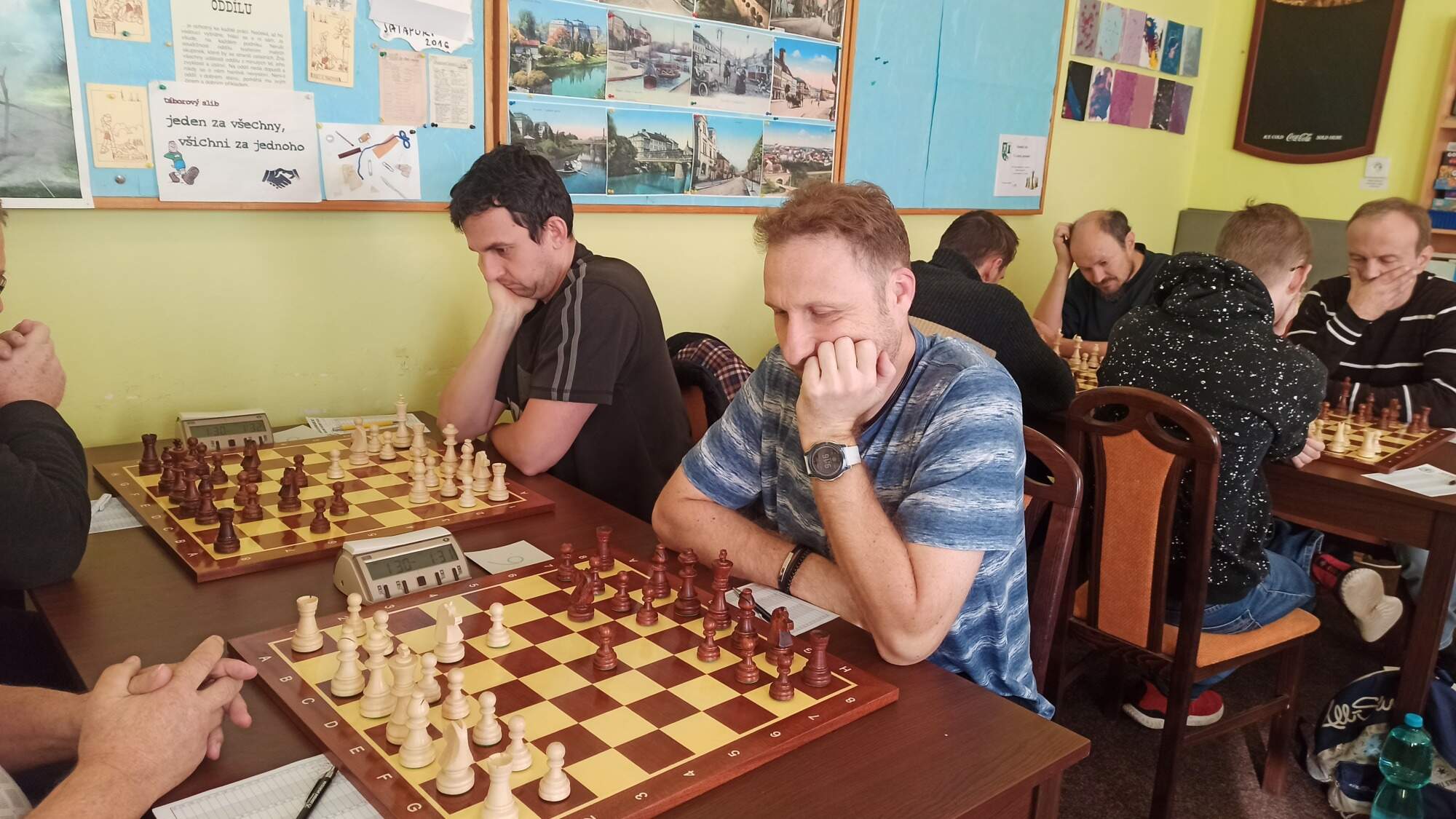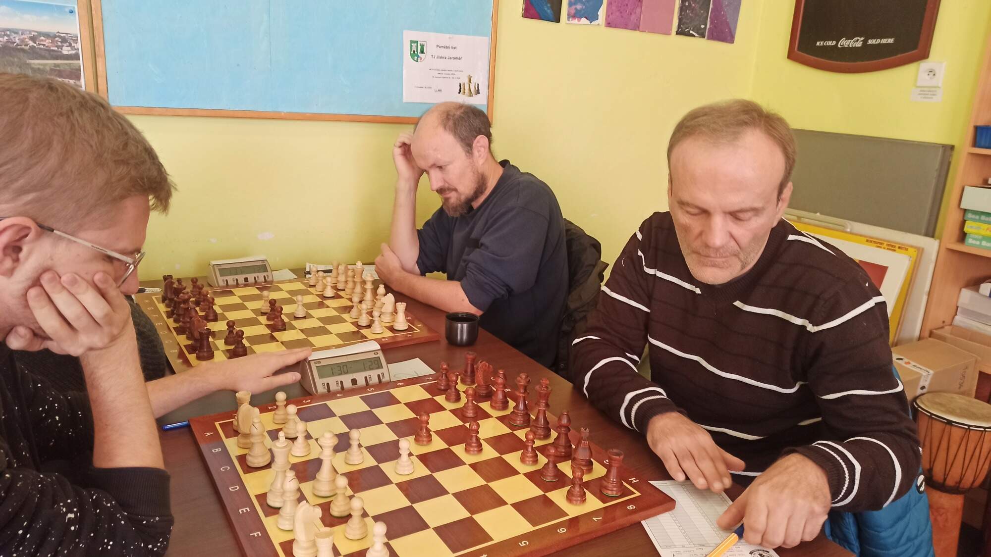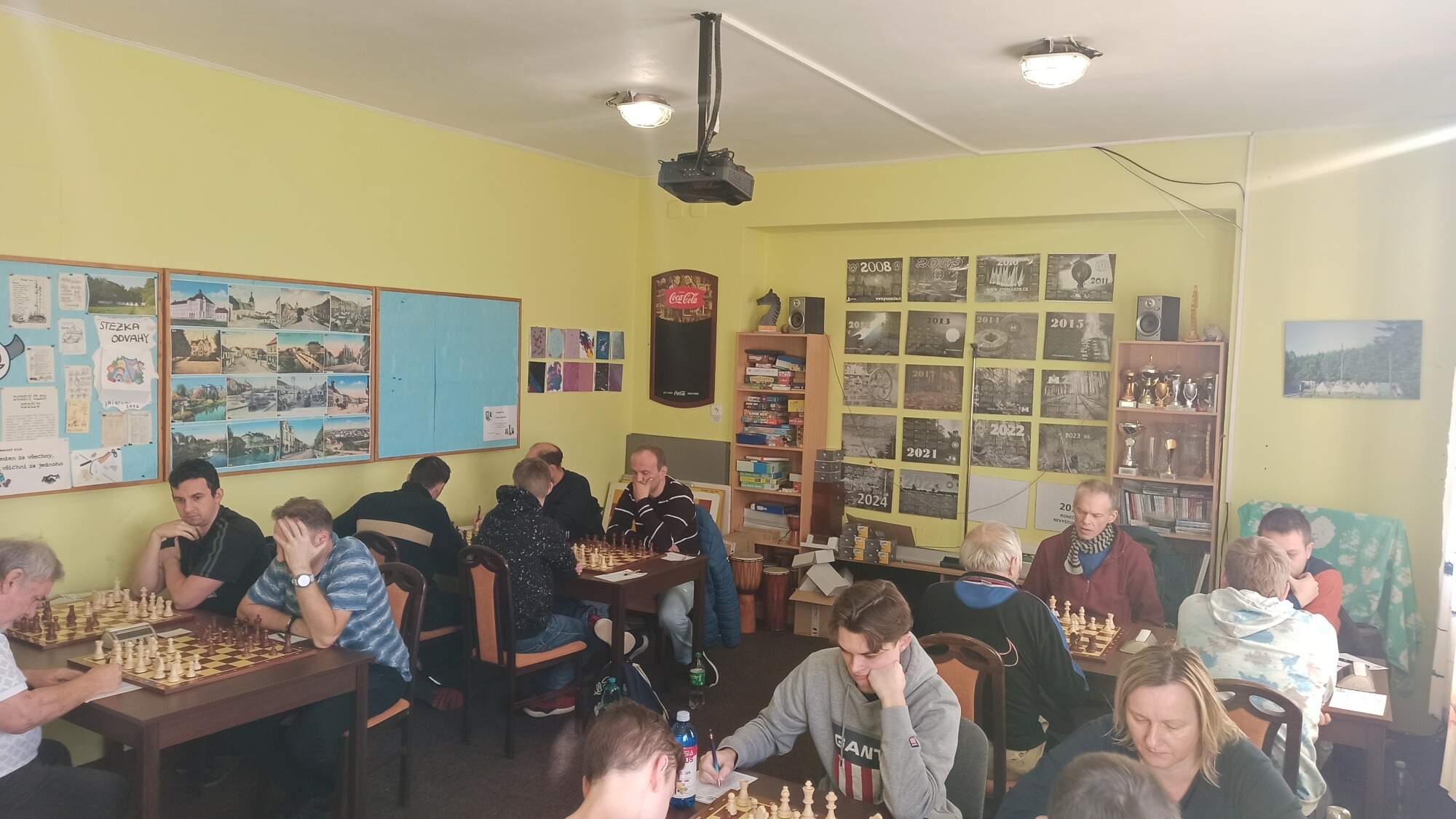 V neděli 19. 10. 2025 jsme sehráli úvodní kolo Krajského přeboru s B týmem Pandy Rychnov. Cíl splněn! Tedy ten nejdůležitější a zároveň první postupný abychom si dobře zahráli. Vítězství se rodilo lehce, vedli jsme již 4:1, ale poslední tři partie byly všechny mizerné, takže Jirka Daniel mi na chodbě vysvětloval, že vlastně máme být rádi za remis. Naštěstí se spletl, ale nepředbíhejme! Pro mě byl zápas specifický tím, že jsem řadu hráčů soupeře (kromě Pandy A proti nám hrála na chodbě ještě Panda, tuším, D proti našemu céčku) viděl o den dřív na soustředění talentů v Rychnově: Zelbu, Kroulíka, Krautschneidera, Kubíčka, Rozuma… a samozřejmě nestárnoucího Jirku Daniela. Bylo poněkud paranoidní najednou stát proti nim.