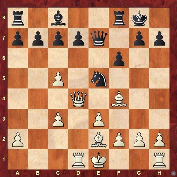 O chvilku později zavěsil Luboš Hubka, hrající na 5. šachovnici s Milanem Dvořákem. Je to jedna ze dvou dnešních partií na téma „když chce soupeř hrát určitou variantu, je slušné do ní vlézt“. Luboš si tak nechal dát bílými Marshalla, ale s pěšcem dělal fóry a vzal si ho až později. Přesto stál v pozici na diagramu hůře! Soupeř měl zkusit 17…Jg6, protože po logickém 18.Sg3 by přišlo… co asi? Místo toho zahrál Vad8 (to není překlep), Luboš poděkoval a kvalitu si vzal.