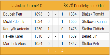 Petr Doubek ve výměnné francouzské hrál bez rošády a v celé partii nemohl najít plán. Potom se rozhodl k oběti pěšce, protože se obával silného postavení soupeřova jezdce. Partii zřejmě rozhodla větší vyhranost, protože Petr začíná hrát po mnoha letech. Zdeněk Michl dohrával v dámském gambitu poslední. Soupeřka sice stále měnila plán hry (nejdříve hrála na královském, později na dámském křídle), ale poziční převahu dokázala udržet. Zdeněk měl v koncovce dvojici střelců, soupeřka však o pěšce více. Vzhledem k rozhodnutému výsledku a rozdílu spotřebovaného času (2 minuty proti 15 minutám) se nechtěl trápit a partii vzdal. Antonín Korityák starší ve španělské hře ztratil v 15. tahu pěšce. Soupeř však v následujícím tahu nechal stát nepochopitelně figuru a karta se rychle obrátila. Krásná obětˇvěže zahájila drtivý útok, který vedl k jedinému zisku bodu našeho celku. Bojovný výkon! Karel Hekele ve skotské měl již od 7. tahu velké problémy s ohroženou dámou. Soupeř mohl několikrát partii rozhodnout, ve 21. tahu dokonce obětí věže za střelce zcela rozvrátit pozici černého s velkým materiálním ziskem, ale zřejmě si chtěl co nejvíce zahrát. Ke konečnému rozhodnutí ve prospěch protivníka došlo až v koncovce. Alois Martínek měl hodně špatný den. Ve skandidávské hře již ve 12. tahu ztratil dámu (za věž), v 16. tahu figuru a v 20.tahu další figuru. Tak lehce soupeř černými figurami zřejmě nikdy nevyhrál. Alois příště předvede jistě lepší výkon.