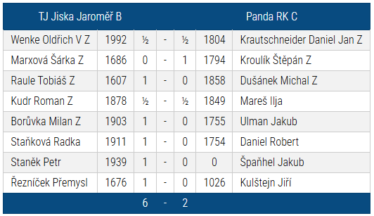 Bodový zisk myslím odpovídal dění na šachovnicích. Díky vysoké výhře 6:2 jsme po úvodním kole na druhé příčce v tabulce. Solidní vstup do sezóny – Panda sice kousala, ale nakonec jsme ji zkrotili. A jak se říká – kdo vyhraje první kolo, míří vysoko. Jen pozor, aby nám ta euforie nevzala chuť k tréninku!