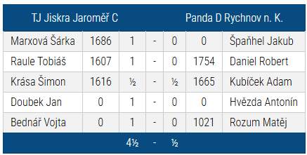 V neděli 19. 10. 2025 se v prvním kole letošní sezóny střetla družstva Jaroměře a Pandy. Podle ela mělo jít o vyrovnaný zápas. Obě družstva tvořili mladí hráči a talenti. Zajímavostí byl ve vedlejší místnosti souběžně hrané utkání KP Jiskra Jaroměř – Panda Rychnov B. Já jsem dělal rozhodčího oběma zápasům. Přišlo nás podpořit 7 diváků. Ve všech partiích se na šachovnici objevily zavřené hry.