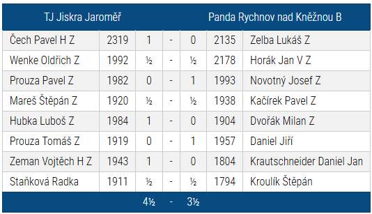 V neděli 19. 10. 2025 jsme sehráli úvodní kolo Krajského přeboru s B týmem Pandy Rychnov. Cíl splněn! Tedy ten nejdůležitější a zároveň první postupný abychom si dobře zahráli. Vítězství se rodilo lehce, vedli jsme již 4:1, ale poslední tři partie byly všechny mizerné, takže Jirka Daniel mi na chodbě vysvětloval, že vlastně máme být rádi za remis. Naštěstí se spletl, ale nepředbíhejme! Pro mě byl zápas specifický tím, že jsem řadu hráčů soupeře (kromě Pandy A proti nám hrála na chodbě ještě Panda, tuším, D proti našemu céčku) viděl o den dřív na soustředění talentů v Rychnově: Zelbu, Kroulíka, Krautschneidera, Kubíčka, Rozuma… a samozřejmě nestárnoucího Jirku Daniela. Bylo poněkud paranoidní najednou stát proti nim.