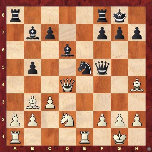 O chvilku později zavěsil Luboš Hubka, hrající na 5. šachovnici s Milanem Dvořákem. Je to jedna ze dvou dnešních partií na téma „když chce soupeř hrát určitou variantu, je slušné do ní vlézt“. Luboš si tak nechal dát bílými Marshalla, ale s pěšcem dělal fóry a vzal si ho až později. Přesto stál v pozici na diagramu hůře! Soupeř měl zkusit 17…Jg6, protože po logickém 18.Sg3 by přišlo… co asi? Místo toho zahrál Vad8 (to není překlep), Luboš poděkoval a kvalitu si vzal.