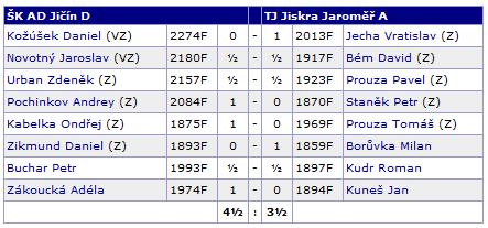 Utkání začalo v klidu a první výsledek se urodil až po zhruba 3 hodinách hry, kdy Petr Staněk v zajímavé francouzské obraně přetáhl strunu a pod hrozbou ztráty materiálu vzdal (0-1). Vzápětí byla zaknihována remíza na 7. desce, kde Roman Kudr dokázal udržet černými neoblíbeného Birda (0,5-1,5). V poslední době skvěle hrající Vráťa Jecha přepočítal při nestejných rošádách v dámském gambitu velmi talentovaného Daniela Kožúška (1,5-1,5). Milan Borůvka hrál na izolovaného pěšce, ale brzy otevřel hru a o pěšce přišel. Soupeř překročil čas v lepší koncovce J+4p proti S+3p (1,5-2,5). David Bém dokázal přehrát Jaroslava Novotného, získal dámu za lehkou figuru a věž. Realizace materiálu vázla na tom, že druhá Davidova věž se nemohla zapojit do hry. I tak je remíza se silným soupeřem dobrá (2-3). Tomáš Prouza obětoval/ztratil dámu za věž a lehkou figuru, měl za to sice aktivitu, ale soupeř se nenechal zaskočit a nic nepřehlédl (3-3). Na poslední 8. desce hrál Jan Kuneš a poměrně dlouho vzdoroval a držel remízové naděje. Nakonec soupeřka dobyla tři pěšce a vyhrála (3-4). Nejdelší byla partie na 3. desce mezi Pavlem Prouzou a Zdeňkem Urbanem. Pavel obětoval kvalitu, ale pozice se stále zjednodušovala, až zbyl po 80. tazích na stole jen Pavlův střelec a Zdeňkova věž. Pavel uklidil krále do správného rohu a dalších 50. tahů již bylo zbytečných (3,5-4,5). Je to druhá těsná porážka s favoritem v pořadí, ale v utkání jsme byli možná o chloupek lepší. Škoda nevyužitých šancí.