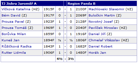 Sněžka TJ Náchod-DDM Třebechovice 6,5:1.5Lázně Bělohrad-Spartak Vrchlabí 4:4Slovan Broumov-TJ Dvůr Králové 3:5ŠK Lípa B-ŠK AD Jičín D 5:3Sokol Hradec Králové-TJ Jiskra Hořice 1,5:6,5Miroslav Martinovský