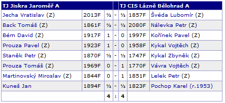 Jecha ve francouzské hře v rovnocenné pozici odmítl několik nabídek smíru, ale rozhodující převahu nezískal. Šachy nehrál několik měsíců a nerozehranost byla znát. Back v dámském gambitu postavil pevnou pozici a protože dobře hospodařil s časem, tak bez větších problémů získal cennou půlku bodu. Bém si ve španělské vytvořil izolovaného „trojpěšce“, což na první pohled nevypadalo dobře. V rozhodující kombinaci však lépe počítal a po zisku figury bodoval. Prouza Pavel ve hře dámským pěšcem odvedl skvělý výkon. Již od střední hry si udržoval iniciativu, získal pěšce a ve věžové koncovce i celý bod. Staněk v caro-kannu získal postupně tři pěšce. V jasně vyhrané pozici však ztratil figuru a jen zásluhou spojených volných pěšců alespoň remizoval. Prouza Tomáš v dámském gambitu stál aktivně. Potom však ztratil kvalitu a za stavu 4:3 neudržel koncovku samotného jezdce proti samotné věži. Martinovský také v dámském gambitu předvedl snad nejhorší hru za posledních pět let. K průlomu se neodhodlal, nesmyslně odevzdal středového pěšce a celá pozice se mu „rozsypala“. Kuneš měl v sicilské hře téměř celou partii iniciativu, ale zkušený soupeř i přes časovou tíseň neudělal žádnou chybu a o bod se rozdělil.