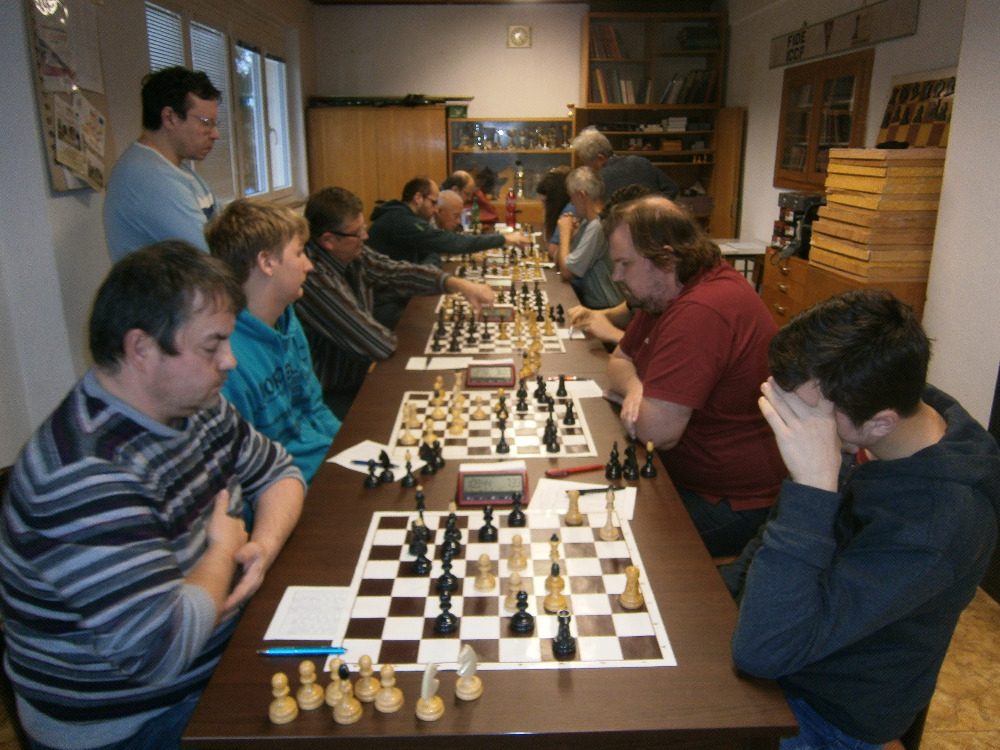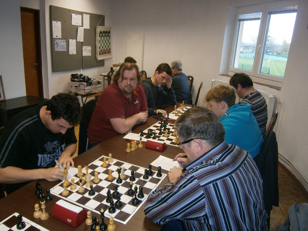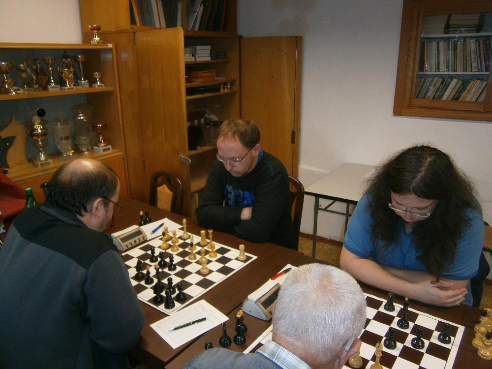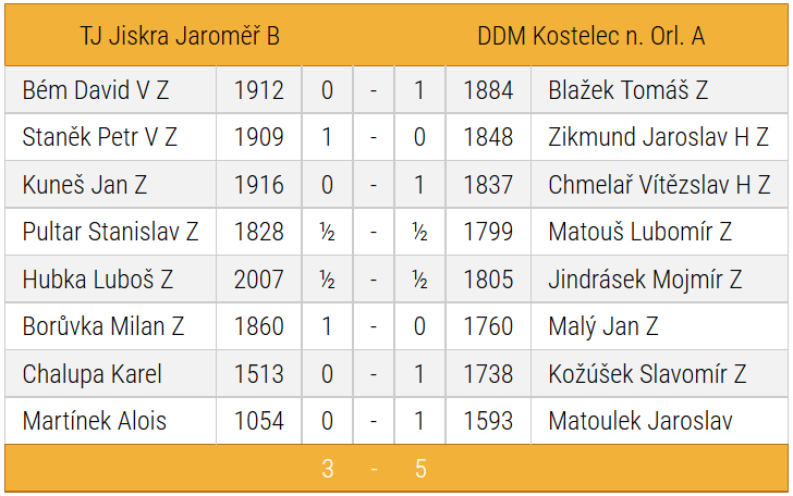 Po polovině odehraných partií to vypadalo nadějně, na osmičce mladý Lojza Martínek přestál hrozbu ztráty figury a stál aktivně, věžemi držel sloupce, měl prostor, zatímco soupeř nepřekročil třetí řadu, Luboš Hubka tlačil na sloupci e, Honza Kuneš měl sice o pěšce méně, ale na šachovnici zůstaly vedle věží nestejní střelci. Pouze na první šachovnici měl David Bém problémy, bílými ve francouzské hře stál hůře, ztratil pěšce a od 16. tahu hrál s jednou až dvěma minutami na hodinách. Jenže na osmičce černý nedopočítal při přechodu do koncovky výměny a výsledkem byla ztráta figury 2,5:2,5. Na trojce se černému podařilo proniknout věžemi na první řadu, černý střelec byl mnohem aktivnější než Honzův, což rozhodlo. Prohráváme 2,5:3,5. Luboš na šestce po tlaku dobyl pěšce, v koncovce lehkých figur přidal ještě jednoho, ale k výhře to nestačilo 3:4.