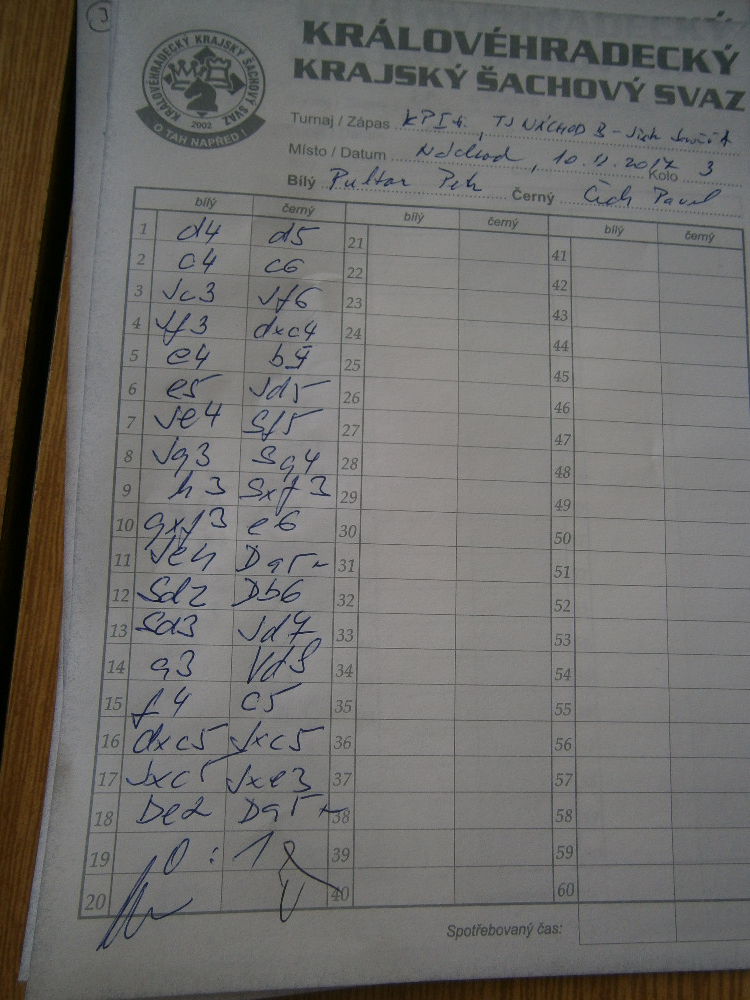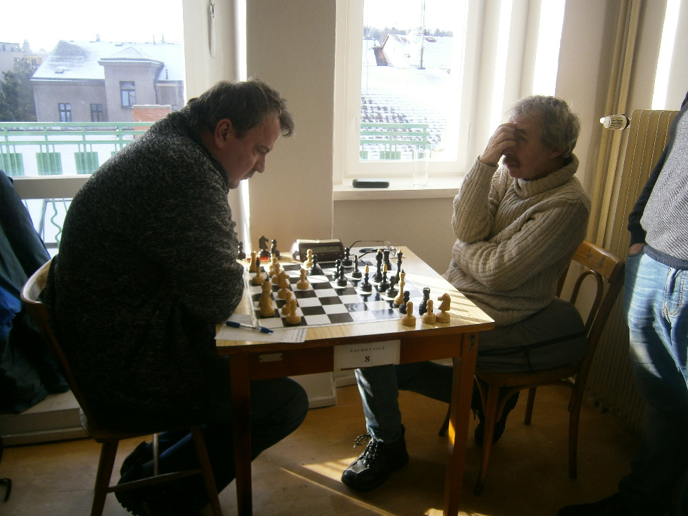 Potom postupně odmítají nabídky remízy od soupeřů Pavel a David. Jako druhý dohrál na prvním prkně hostující IM Pavel Čech. Patří mu poděkování, protože ještě v sobotu hrál v Košicích slovenskou extraligu. Hrála se slovanská obrana a Petra Pultara na druhé straně šachovnice bez větších problémů rozdrtil v miniaturce. Podle jeho slov hrál přesně. Soupeř položil krále v 18. tahu, dva tahy před matem na d2. Super partie, vedeme 2-0!