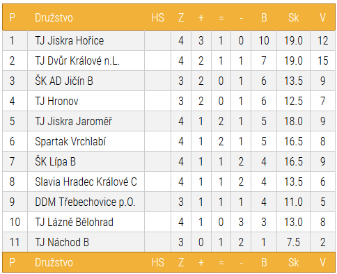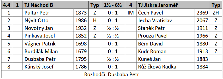 Za konečný výsledek 6,5 – 1,5 pro hostující Jaroměř jsme byli pochváleni Mirkem Martinovským na tradiční pozápasové tiskovce v kavárně Žákova Studovna. Závěrečná část trilogie tak upravila náchodský účet na 2:1 z pohledu Jaroměře. V tabulce nám po čtvrtém kole patří lichotivé 5. místo a aktivní skóre.
