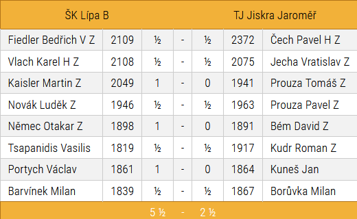 Na první šachovnici letos podruhé nastoupil Pavel Čech. Soupeřem mu byl velezkušený Bedřich Fiedler. Pavel dle svých slov nesehrál dobře zahájení, Béééda získal velkou prostorovou převahu a... nabídl remízu, kterou Pavel raději přijal. Na druhé šachovnici jsem nastoupil já (Vráťa Jecha). Mým soupeřem byl, pro mě celkem neznámý, Karel Vlach. Na moji partii se přesně hodí první část nadpisu. Sice jsem neměl na soupeře moc partií, přesto jsem přesně odhadl, co budeme hrát. Jenže na přípravu jaksi nebyl čas (a když byl, tak nebyla síla), zahájení jsem sehrál velmi pasívně a i když jsem měl bílé, bojoval jsem o vyrovnání v pozici já. Snad se mi podařilo nakonec pozici alespoň trochu vyrovnat, ale zatímco soupeř spotřeboval cca 18 minut, já o více jak 60 minut více). Když mi soupeř nabídl remis, těžko jsem mohl odmítnout. Na třetí šachovnici hrál domácí Martin Kaisler s naším Tomášem Prouzou. Pozici jsem poprvé viděl až v momentě, kdy domácí zahrál nepříjemný "zvedák" Vxc6. Tomáš prý počítal braní na c6 vším možným, kromě věže. Výsledkem byl pěšec méně. Po několika minutách jsem se Tomáše zeptal: "Máš šanci to udržet? Máš o pěšce méně." Tomáš stručně odpověděl: "Už o dva". Tak zkušený hráč, jako je Martin Kaisler si výhru již nenechal proklouznout mezi prsty. Čtvrtá šachovnice, za domácí Luděk Novák, za Jaroměř Pavel Prouza. Pozici jsem viděl prakticky až v okamžiku, kdy Pavel přijal nabídku remízy. V rychlosti musím souhlasit s Pavlem, že může být rád za remízu, protože jinak by o ni dalších 30 tahů bojoval. Soupeř stál lépe (minimálně na první pohled). Pátá šachovnice a náš David Bém hrál s Otou Němcem. Partie skončila až po mém odjezdu. David prý stál dobře, odmítl remis. Ale nakonec se něco nepovedlo a svůj boj na šachovnici prohrál. Na šesté šachovnici hrál Roman Kudr, soupeřem byl Vasilis Tsapanidis. Dle svých slov stál Roman po zahájení dobře. Pak však přehlédl jeden soupeřův tah a pozice se celá nějak zablokla a prý s tím nešlo nic dělat. Honza Kuneš na sedmé šachovnici bojoval s Vaškem Portychem. Když jsem odjížděl, tak sice již přicházel o pěšce na d5, ale soupeř měl natahané pěšáčky před králem (g4 a h4), Honza měl pika na f4, tak jsem si říkal, že bude určitě "kalit vodu". Soupeř se ale asi nespletl. Tak holt musíme s Honzou někdy dojít zakalit jinak. Partii na osmé šachovnici mezi naším Milanem Borůvkou a domácím Milanem (hele, taky Milan) Barvínkem jsem vůbec neviděl. Prostě plichta.