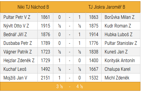 Celkem jsme vyhráli 4,5-3,5. Výsledek je vzhledem k sestavě, s jakou jsme do Náchoda jeli, velmi pěkný.