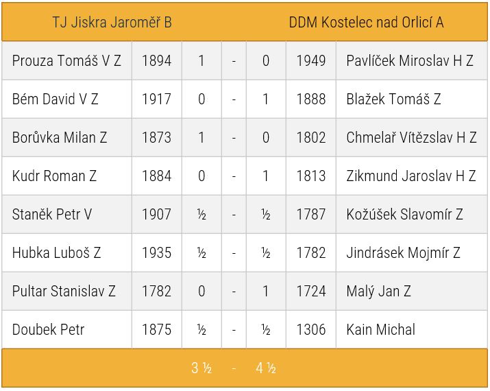 se rozehrálo derby mezi domácí TJ Jiskra Jaroměř B a DDM Kostelcem nad Orlicí. Nevím, zda jsem pořadí, kdo, kdy a jak skončil, zaregistroval přesně, protože jsem byl zaneprázdněn svojí partií. Nicméně pár poznatků ze zápasu tu mám.