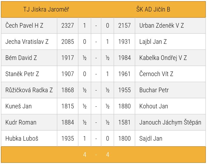 V deštivou neděli (mj. ideální počasí na šachy) 9. 12. 2018 jsme na domácím stadionu sehráli napínavé utkání 4. kola Krajského přeboru. Soupeři z Jičína přijeli ve slušné sestavě plné mladých talentů a tak jsme očekávali zajímavé partie.