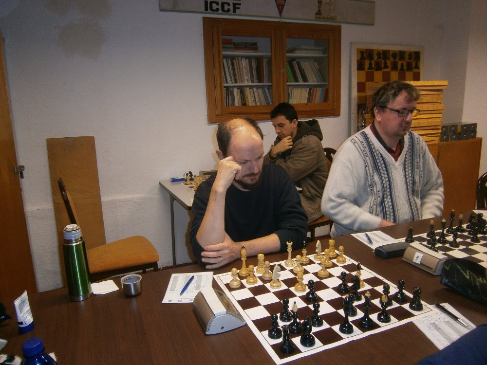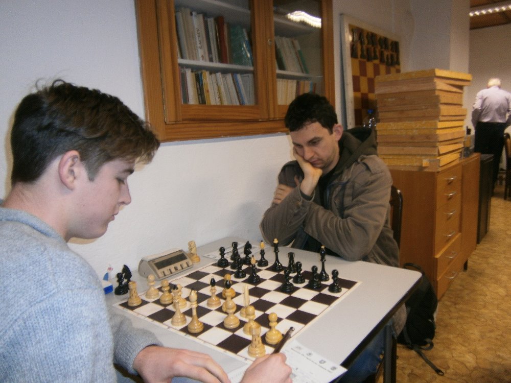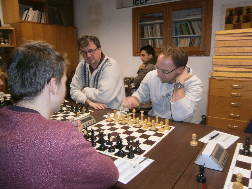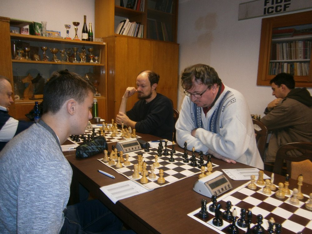 Na 1. šachovnici měl Pavel za soupeře hlavního sponzora (vlastně majitele) jičínského oddílu. V dračí variantě sicilské zahrál málo obvyklé 5.c3, což zřejmě láká k tahu e5, který není v dané pozici určitě dobrý. Již v 9. tahu osamocený pěšec d7 mně našeptával, že vedeme 1:0, protože hráč Pavlových kvalit dokáže takovou slabinu využít. Potom jsem nepochopil, proč soupeř odevzdal pěšce na a6. Zřejmě přehlédl 19.Jf3 s útokem věže po d sloupci. Po 20...f5 už se pozice soupeře tak „sypala“, že hrát až do 35. tahu muselo být pro vůdce černých figur spíše neradostí ze hry.