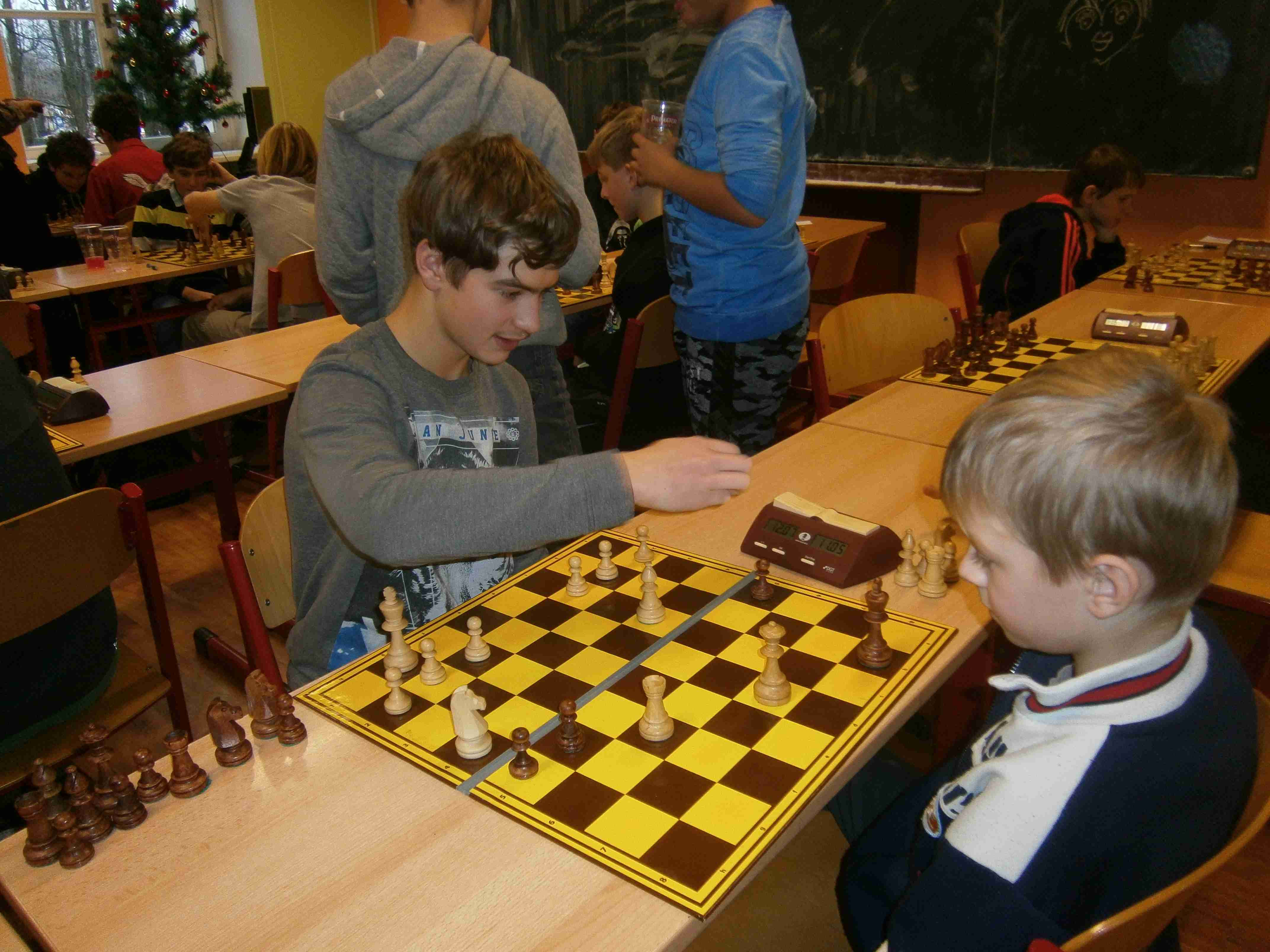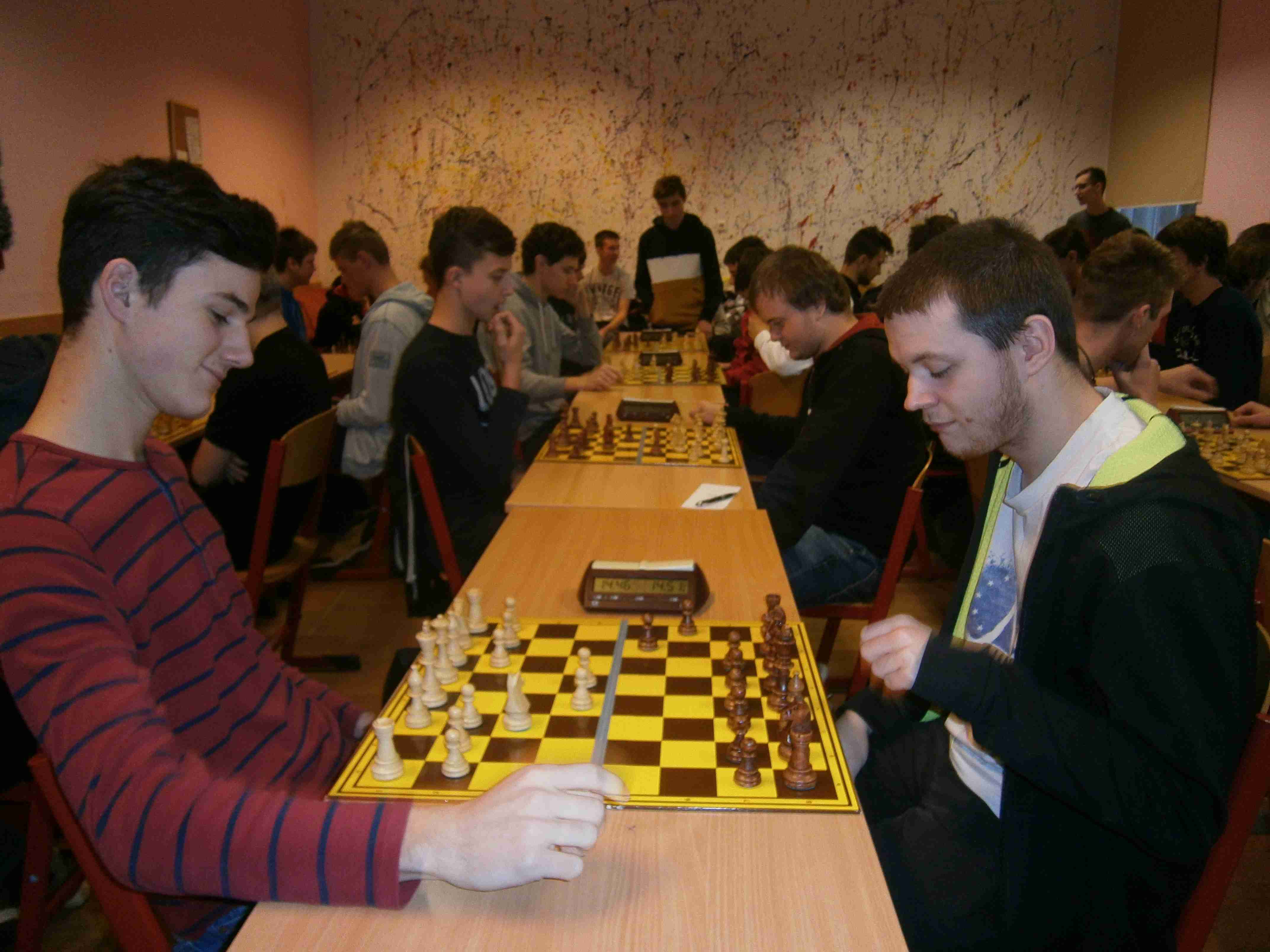 V úterý 11. 12. se na Jiráskově gymnáziu v Náchodě konal Okresní přebor čtyřčlenných školních družstev v šachu. Ve třech kategoriích se spolu utkalo 93 hráčů (19 + 36 +38)ve 21 družstvech z patnácti škol. Hrálo se systémem každý s každým rapid tempem 2×15 minut na partii. Byl jsem na místě jako doprovod pěti družstev ze SPŠS a OA Náchod. Hráči z našeho oddílu startovali v 7 týmech ve všech kategoriích. Na školách v Jasenné, Rychnovku a Na Ostrově nepodařilo poskládat družstvo. Škoda. Bodování bylo olympijské, počítal se každý uhraný půlbod. Na turnaji jsme se podíleli i pořadatelsky. Pomáhal jsem chystat dvě nejstarší kategorie a také jsme zapůjčili šachové hodiny.