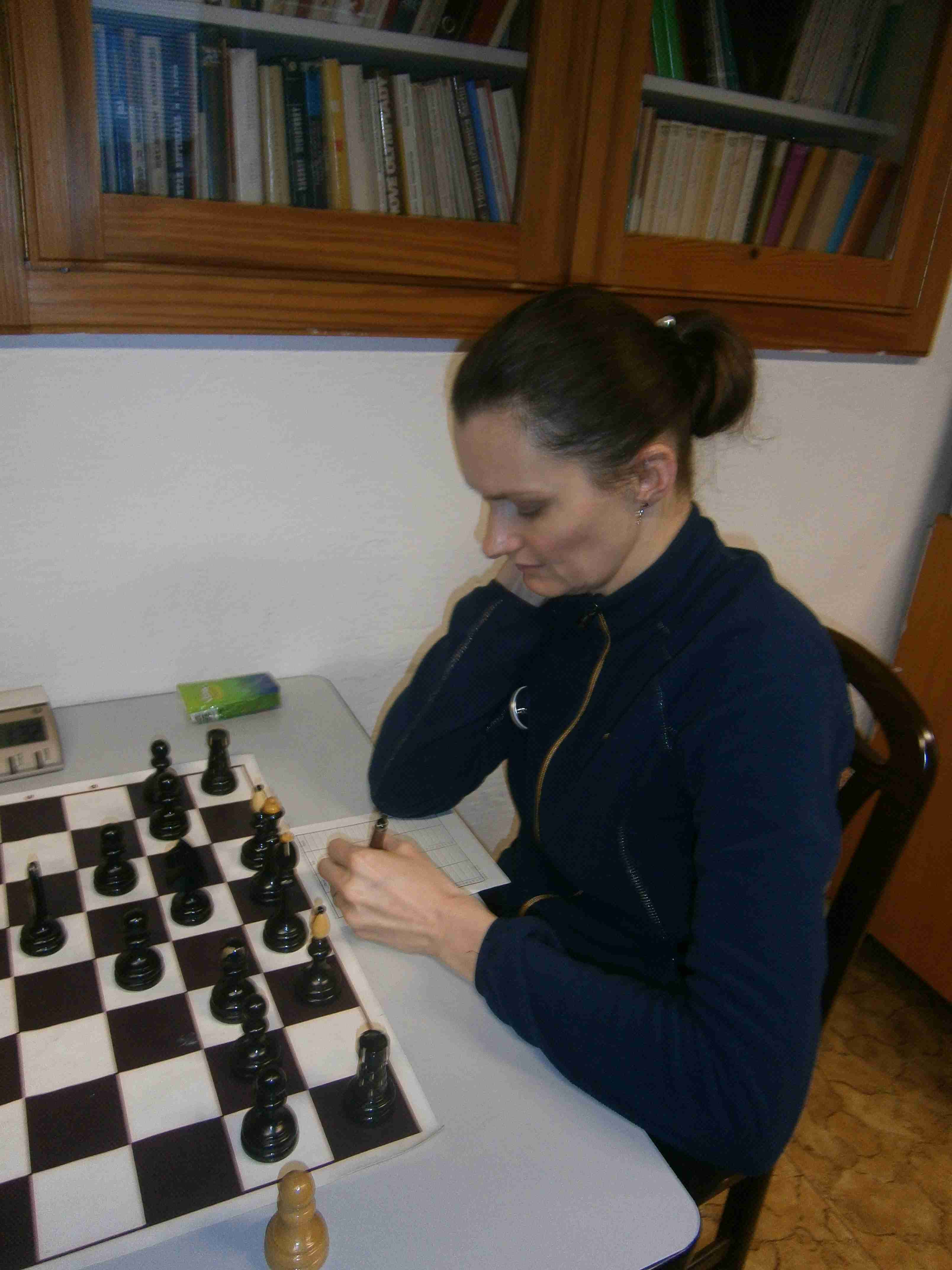 První bodík zaznamenala na osmém prkně Lída Rutter. Černými v klidu bránila srdnatý útok soupeře, postupně sbírala nabízené figurky, a ačkoliv její král zůstal na h8 téměř „nahý“, bílý neměl dost materiálu k jeho ohrožení a nakonec dostal mat. Vedeme 1:0.