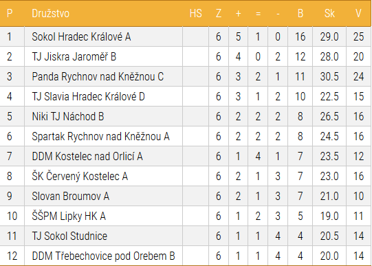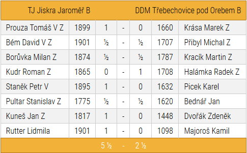 Do šachového nového roku jsme s B družstvem úspěšně vstoupili v neděli 13. 1. 2019 domácím utkáním 6. kola KS s týmem Třebechovice „B“. Radku a Luboše ze základu, plně nahradili Petr a Lída. V utkání jsme byli, už vzhledem k postavením obou týmů v tabulce, favority.