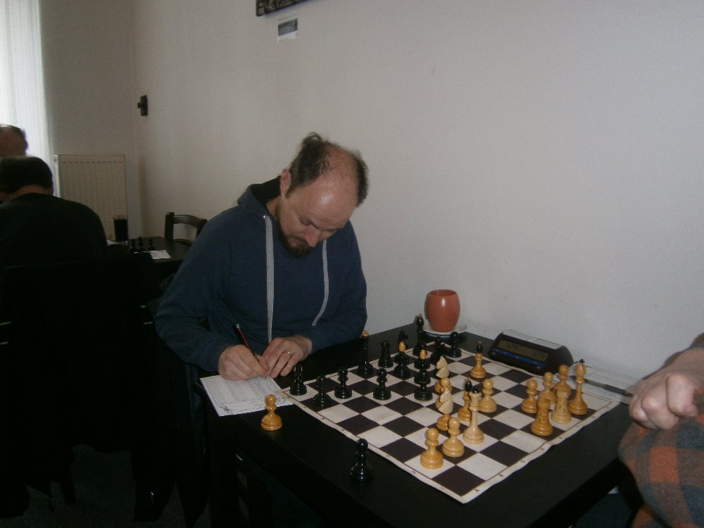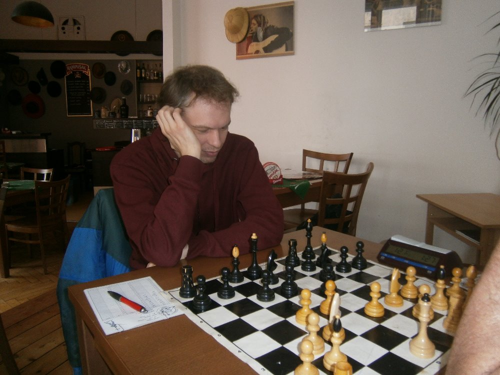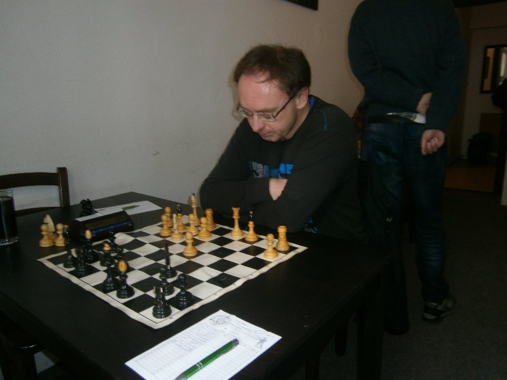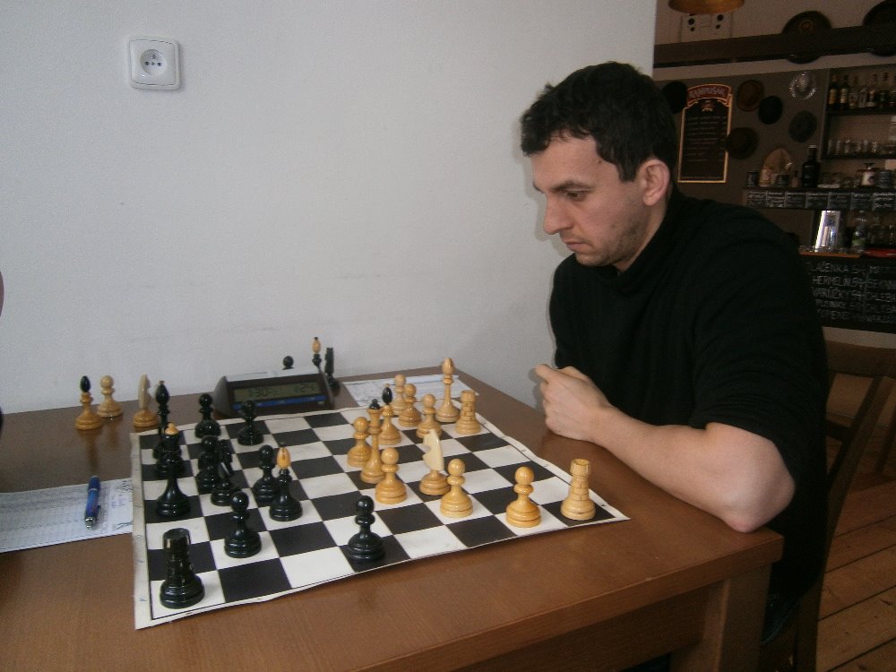 Zcela po zásluze jsem tento zápas "vejce dne". Vlastně i vejce týmu, protože jsem jako jediný prohrál. Celý týden ležím doma a léčím chřipku. Myslel jsem si, že o víkendu již budu v pohodě, ale nebylo tomu tak. Proto jsem šel k partii s myšlenkou "hop nebo trop". Budu hrát divoce a buď se mi podaří soupeře ošálit a za 2 hodiny vyhraju, nebo rychle prohraju, ale na dlouhý boj jsem si nevěřil. Paradoxně jsem končil po 3,5 hodinách prakticky předposlední. Rozehrála se sicilka, dračí varianta. Soupeř na mě "velmi prudce nastoupil" na dámském křídle. Já reagoval "debilně" a prakticky vzápětí "velmi prudce vystoupil". Serie asi tří slabých tahů způsobila, že jsem byl o figuru lehčí. Měl jsem za ni však tři pěšáčky a nějaké šance tam určitě byly (proti počítači ne, ten by mě zmastil, ale my jsme jenom lidi). Soupeř však pokračoval velmi dobře a vše pokryl (jo, je to sicilka, rozdílné rošády, počítač občas hlásí "blbý" tah také u soupeře, ale to je počítač). Naštěstí jsme vyhráli, protože jinak bych si vyčítal, že jsem se nakonec přeci jenom neomluvil a nenechal hrát někoho zdravého.