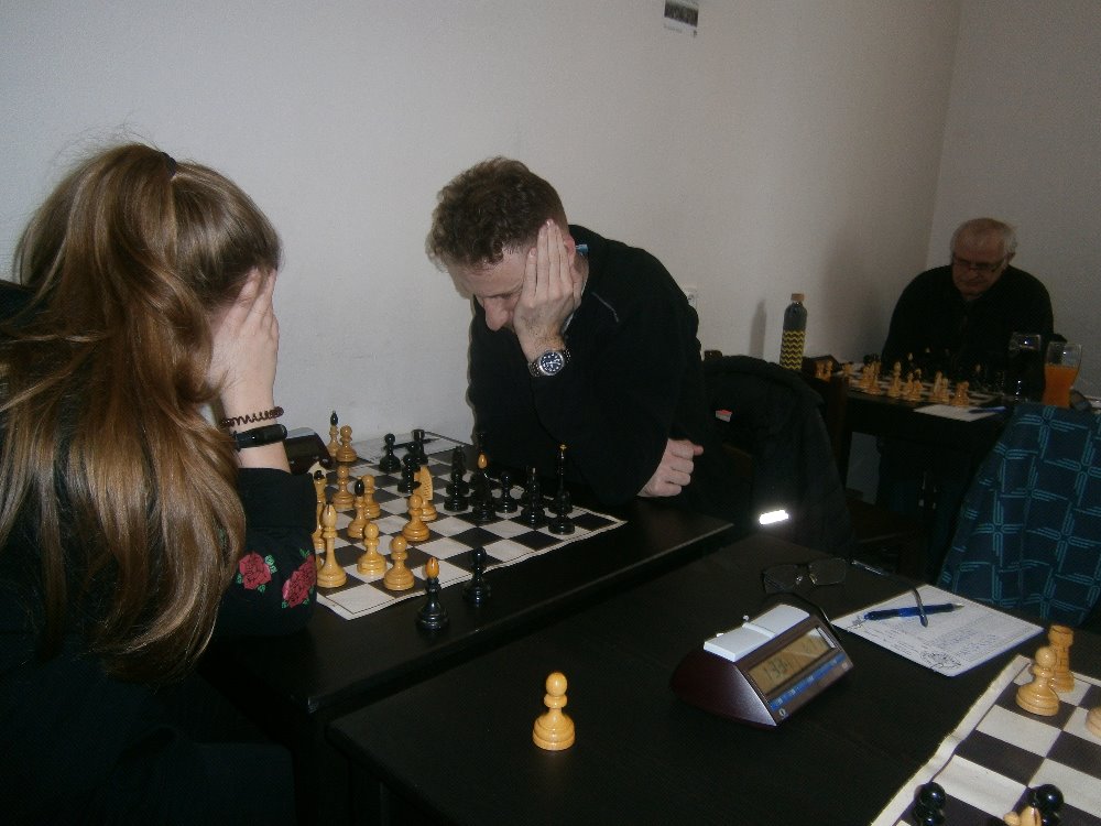Tady se ze začátku partie "poněkud vlekla". V době, kdy já měl figuru míň a byl prohraný, tak tady bylo provedeno jen asi 11 tahů. Někdy v tuto dobu Vasilis nabídl remiz, ale Radka odmítla. Její soupeř měl spotřebováno již hodně času. A přesto stál hůř. Radka velmi silně tlačila (tedy myslím jako na šachovnici) na bod f7 - střelec na c4 (mimochodem, druhý na c5), dáma někde na f3, věž na f1 (otevřený "f" sloupec), Soupeřův král "pěšky" došel na g8, tedy zavřená věž na h8, prostě Radka stála dobře. V době, kdy já vzdával, slyším Radčin hlas "Čas!". Ale i na pozici prý již byla vyhraná. Super výkon.