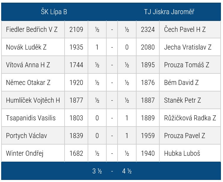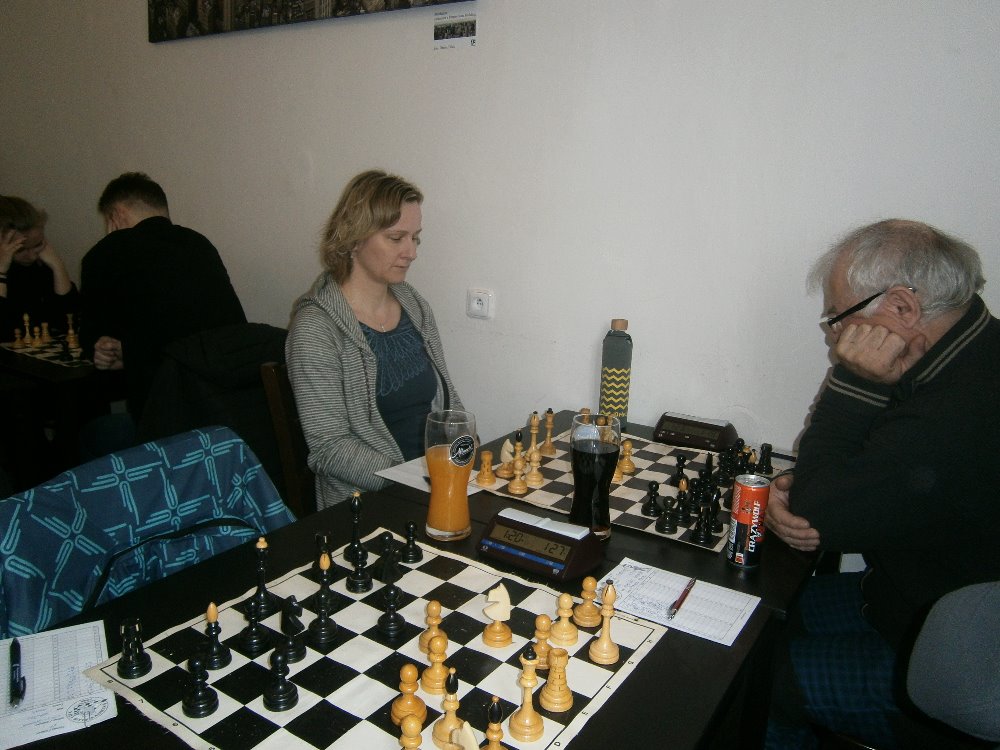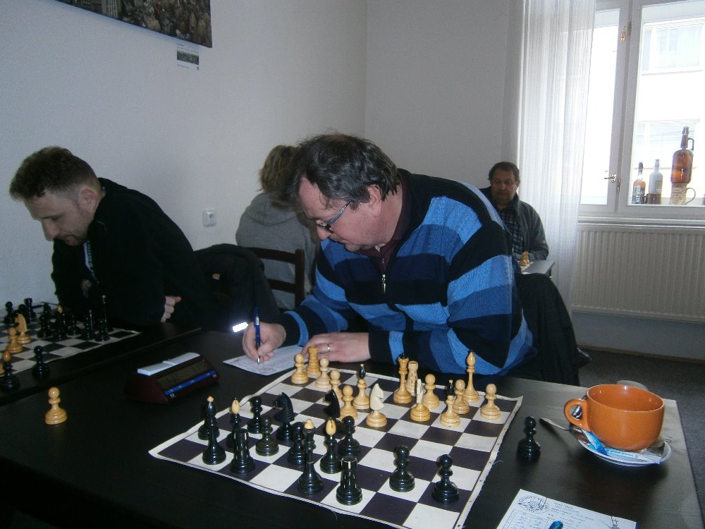 Pavel začíná být takový náš talisman. Nastoupil za nás 5x a ve všech zápasech jsme bodovali (4 výhry, jedna remíza). Bez Pavla jsme 3x prohráli a jen jednou remizovali. Ale k partii. Oba soupeři se potkali již loni a partie skončila opět remízou. Co jsem z Pavlovi partie viděl přes uličku - hrál se dámský gambit, ale Pavel zvolil ve druhém tahu e6 (loni c6). Moc neumím pozici posoudit. Bílý měl určitě prostorovou převahu, ale černá pozice mi přišla velmi pevná, prakticky bez slabin. Patrně by následoval dlouhý strategický boj, ale podobně jako loni, Béda nabídl remízu a ta byla přijata.