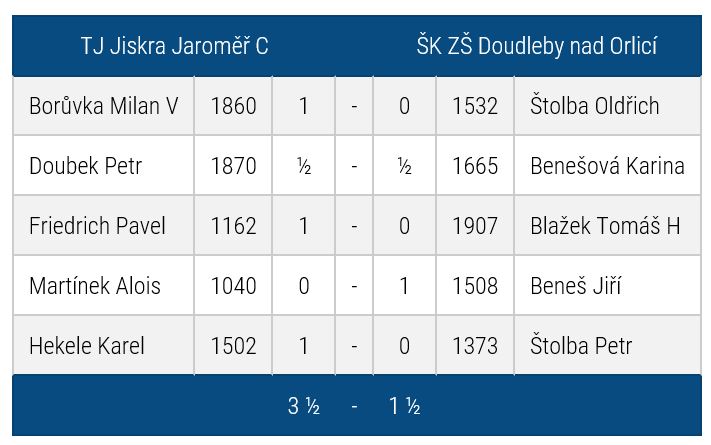 - letos je remízový král) Petr Doubek s Karin Benešovou. V jednu chvíli asi mohla Petrova soupeřka obětovat figuru za dva volné spojené pěšce. Osobně bych v rapidu ani blicce neváhal, ale partie za družstva je něco jiného = remíza. Celková výhra 3,5-1,5 je skvělá! Jen nemohla zaznít hláška z Okresního přeboru: "Ty vole, my tečem s Doudlebama...