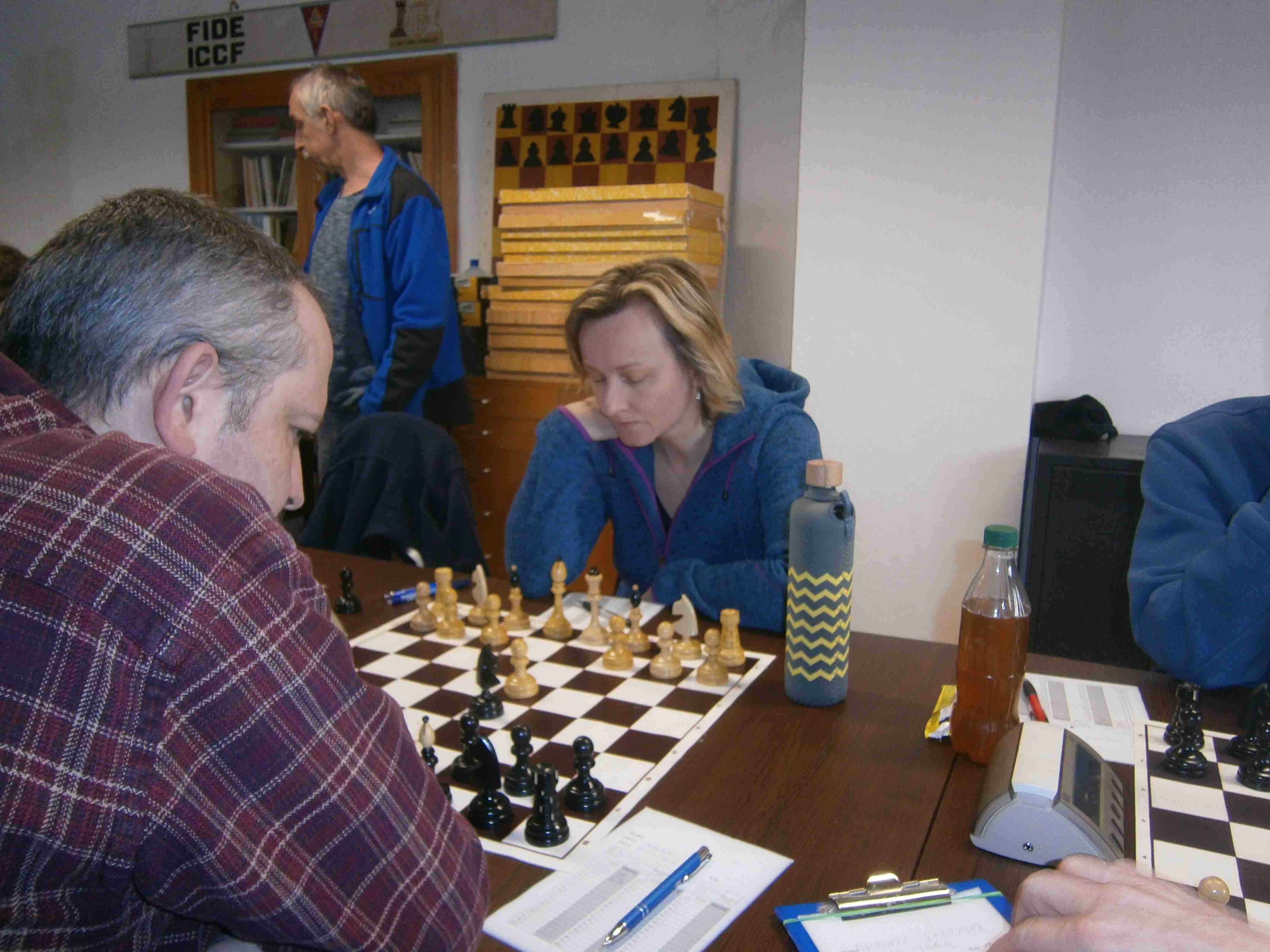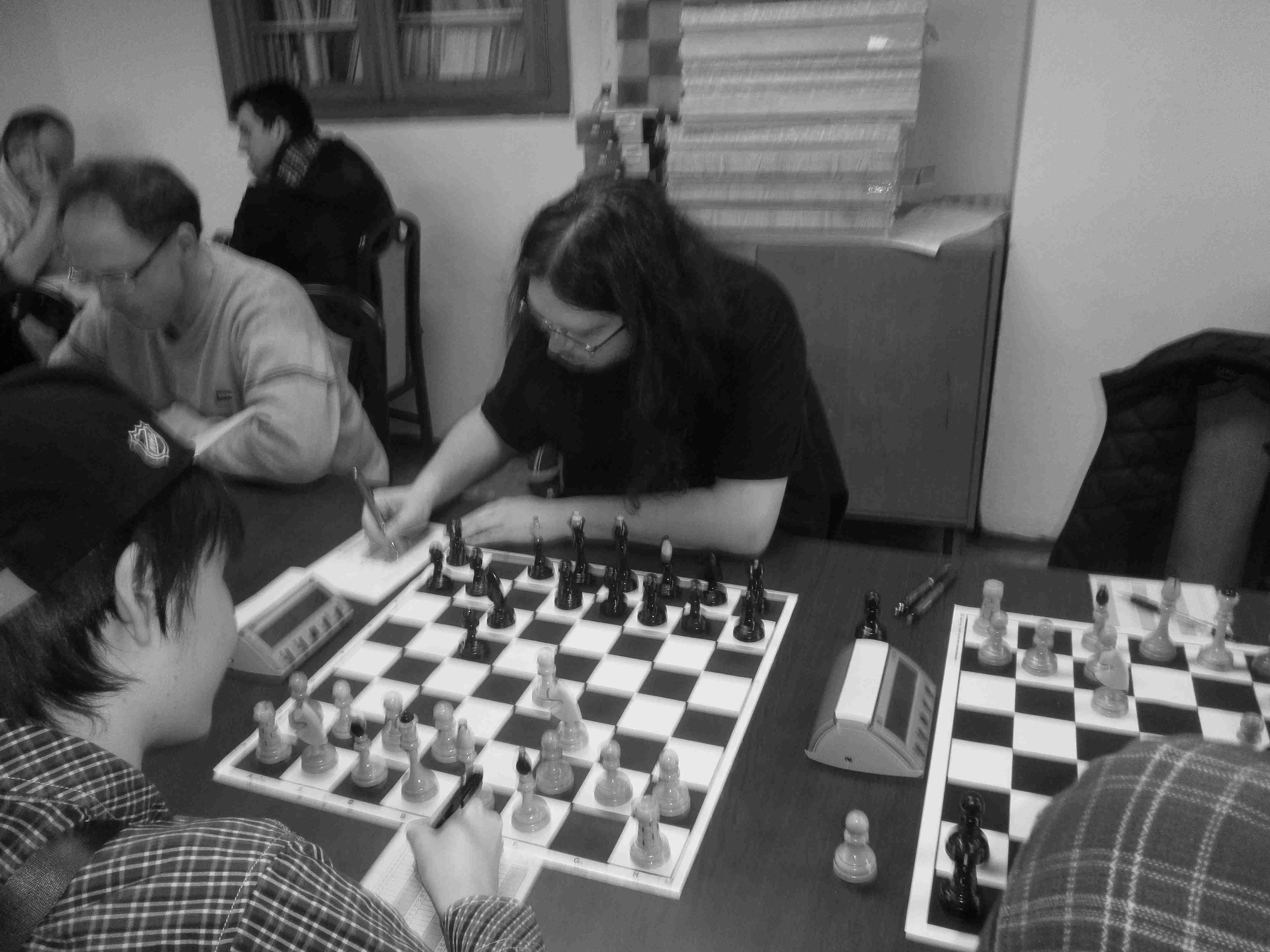 S mladým a velmi talentovaným soupeřem hrává téměř pravidelně Radka, ale tuto neděli to o jednu šachovnici nevyšlo. Přišlo mi, že bílý nastoupil k partii s cílem lepší půlka, nežli nulka a celkem ochotně nabízel figury na výměnu. A Petr se toho chytil. Ani jeden ze soupeřů se moc neodvažoval zahrát nějaké nestandardní tahy. Nemyslel jsem si, že někdy napíšu o otevřené sicilce s tahem e5 za černého, že je to nuda, ale ve srovnání s partií na druhé šachovnici se tady opravdu nic divokého nestalo. Zasloužená remíza.