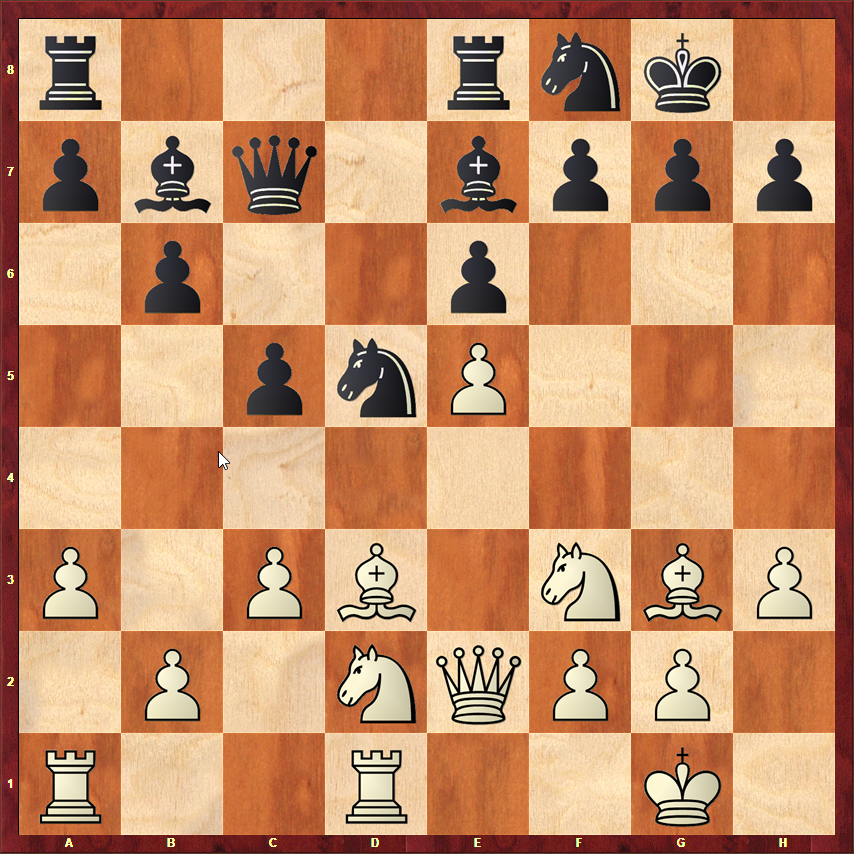 Tuto partii jsem moc neviděl. Myslím si, že skončila jako první rozhodnutá. Při odchodu mi Jarda Čáp povídá: „Až budeš psát zprávu, napiš, že to byla hrozná partie“. Já bych to ale zas až tak hrozně neviděl. Je pravda, že v pozici na diagram stojí bílý lépe. Černý koník na d5 sice vypadá, jako velmi silná figura, jen jaksi nemá nožičky a hrozí jeho ztráta po c4. Počítač mi nakonec za černého doporučil 15… Dc8 a pozice je cca +1 pro bílého. Jarda však zvolil tah 15… g5. Sice udělal ústupové pole f4 pro koníka, ale takové odkrytí krále a vytvoření takových slabin, jako je f6, to nemohlo být dobré. David také tohoto oslabení plně využil a celkem záhy získával kvalitu (na f6 se za pár tahů dostal kůň) a spolehlivě vyhrál.