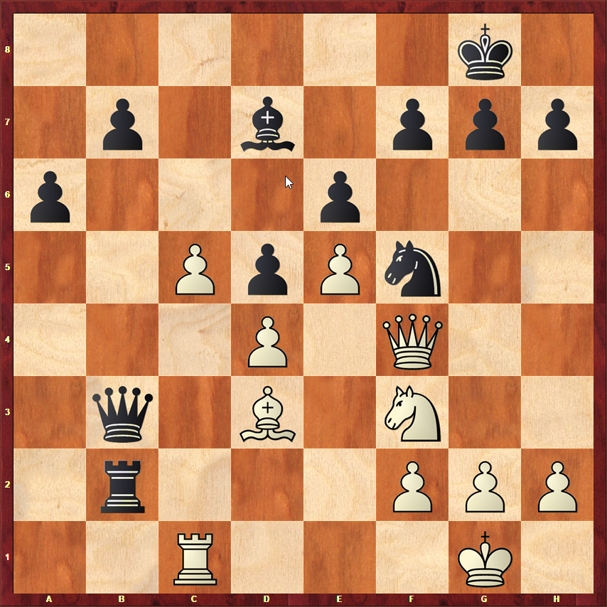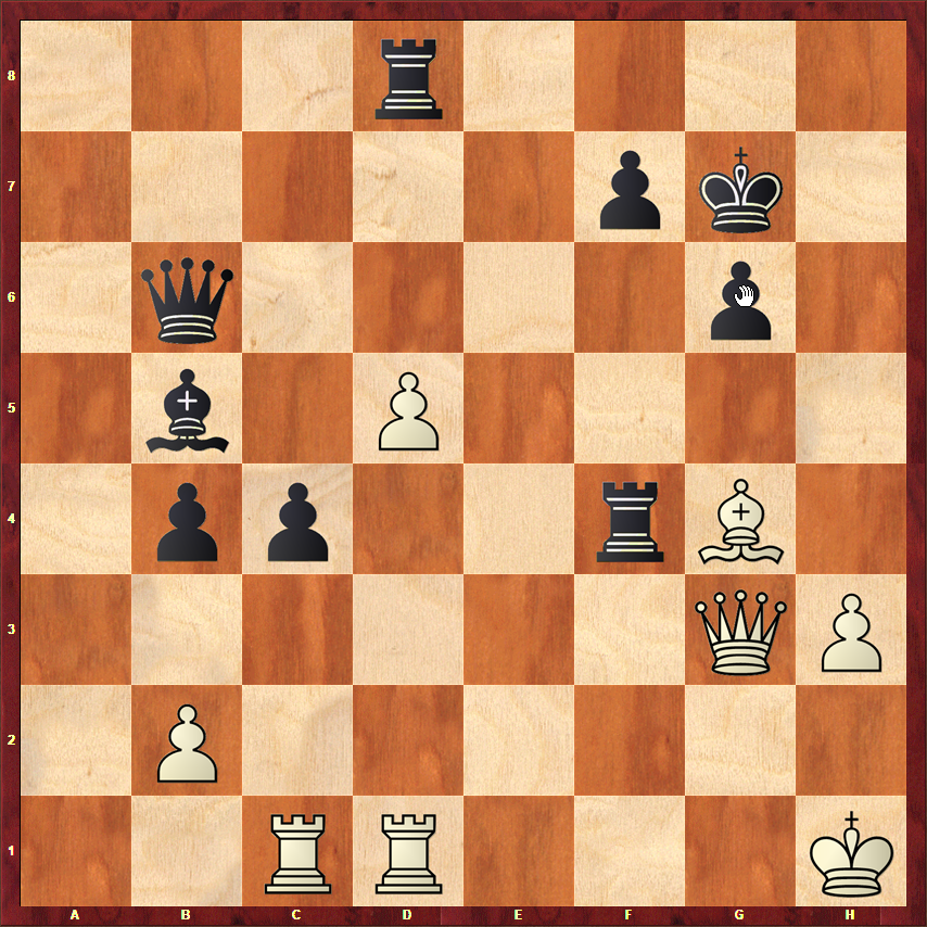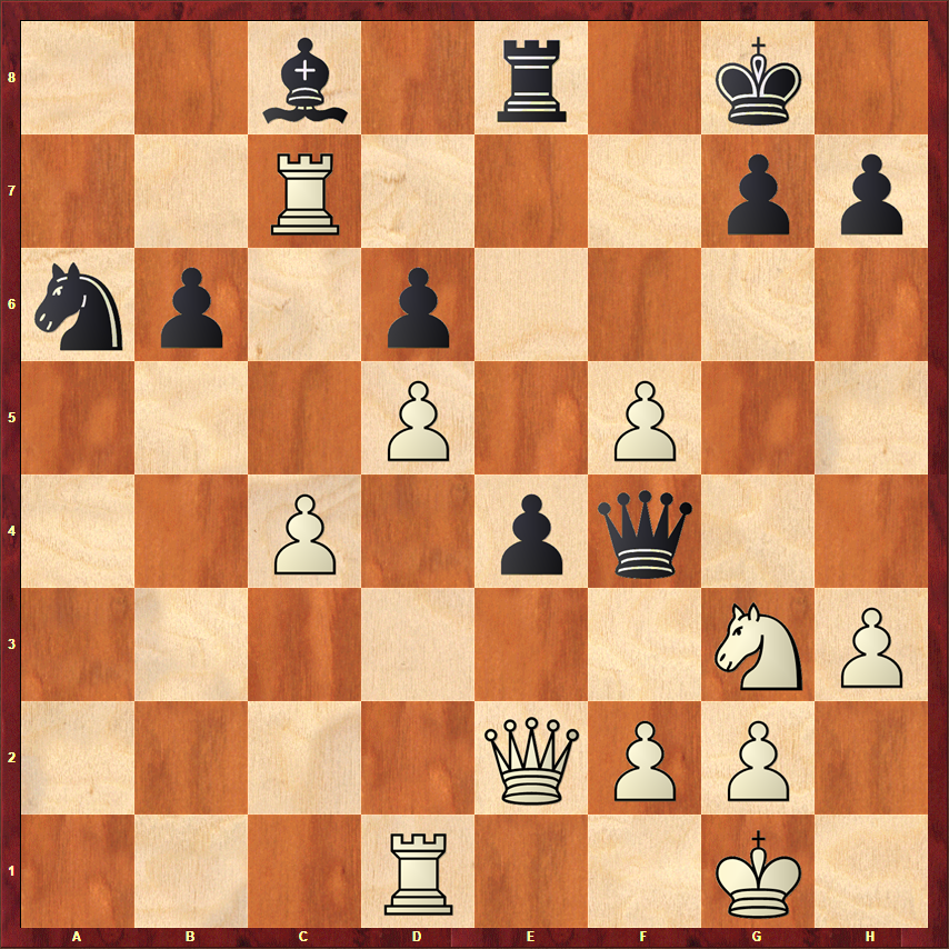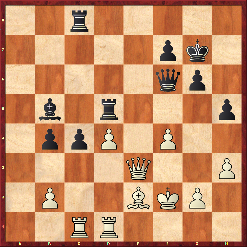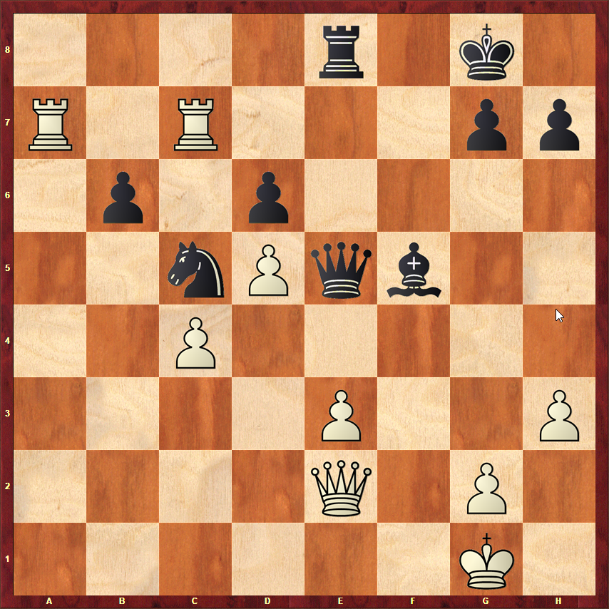 Zde mělo přijít 35. … Ve8 již s velkou výhodou černého. Bílý přestává krýt pěšce na d4 (po 36. Dd2 přijde c3) a bílá pozice se pomalu hroutí. Bohužel Pavel toto neviděl (ani já, jako kibic). Stále však stál černý výrazně lépe. Bohužel, časová tíseň udělala své a černý vlastně jedno tahově nastavil věž. Tedy bylo to dva tahy – šach a pak žeru – viz diagram.