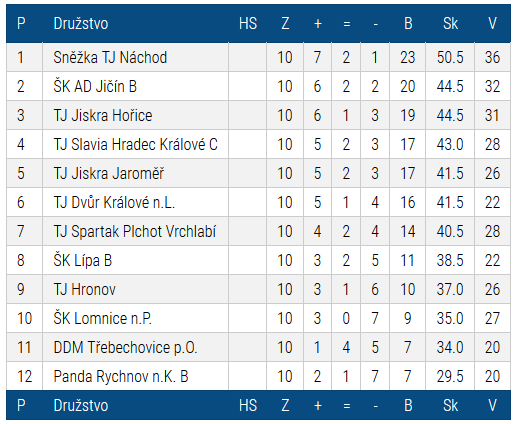 Před posledním kolem se situace v tabulce tak nějak … trochu vyjasnila a hodně zamotala. Náchod v čele má 3 body náskok a výrazně lepší všechna pomocná hodnocení. Napsal bych, že určitě postupuje, ale po zkušenosti ze sezony 2016/2016, kdy Náchod zapomněl, že poslední kolo se hraje od 9 hodin a přijel až na 10 hodinu (ještě s mírným zpožděním), tak raději napíšu, že Náchod postoupí z 99%. Určitě nikdo nečekal, že Hořice prohrají s do té doby posledními Třebechovicemi a vypadnou z boje o postup. Naopak Třebechovice se odpoutaly od posledního místa, na které odsunuly Rychnov. Ten má navíc horší pomocná hodnocení a hraje … s prvním Náchodem. O počtu sestupujících se rozhodne již tento víkend – záleží na umístění Jičína ve druhé lize.