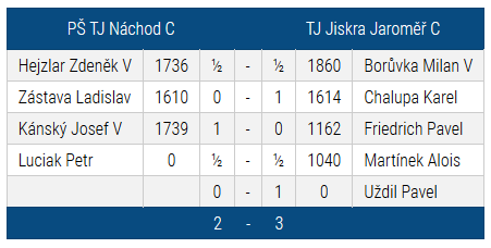 Desáté kolo Regionálního přeboru A připadlo na neděli 24. 3. 2019. Jeli jsme do Náchoda proti místnímu C-družstvu v sestavě Milan Borůvka, Karel Chalupa, Pavel Friedrich, Alois Martínek a Pavel Uždil. Náchodský tým je složený především z velmi zkušených hráčů doplněných mladíky, kteří se partii od partie stále zlepšují.
