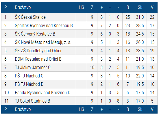 Tím RP A pro jaroměřské družstvo skončil, kvůli lichému počtu družstev máme v posledním kole volno. Díky vítězství můžeme skončit nejhůře na 8. příčce. Naše družstvo se v regionálním přeboru neztratilo a především mladí hráči v něm získali cenné zkušenosti. Tabulka před posledním 11. kolem: