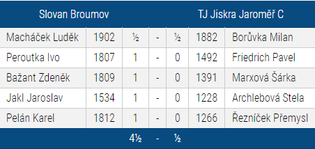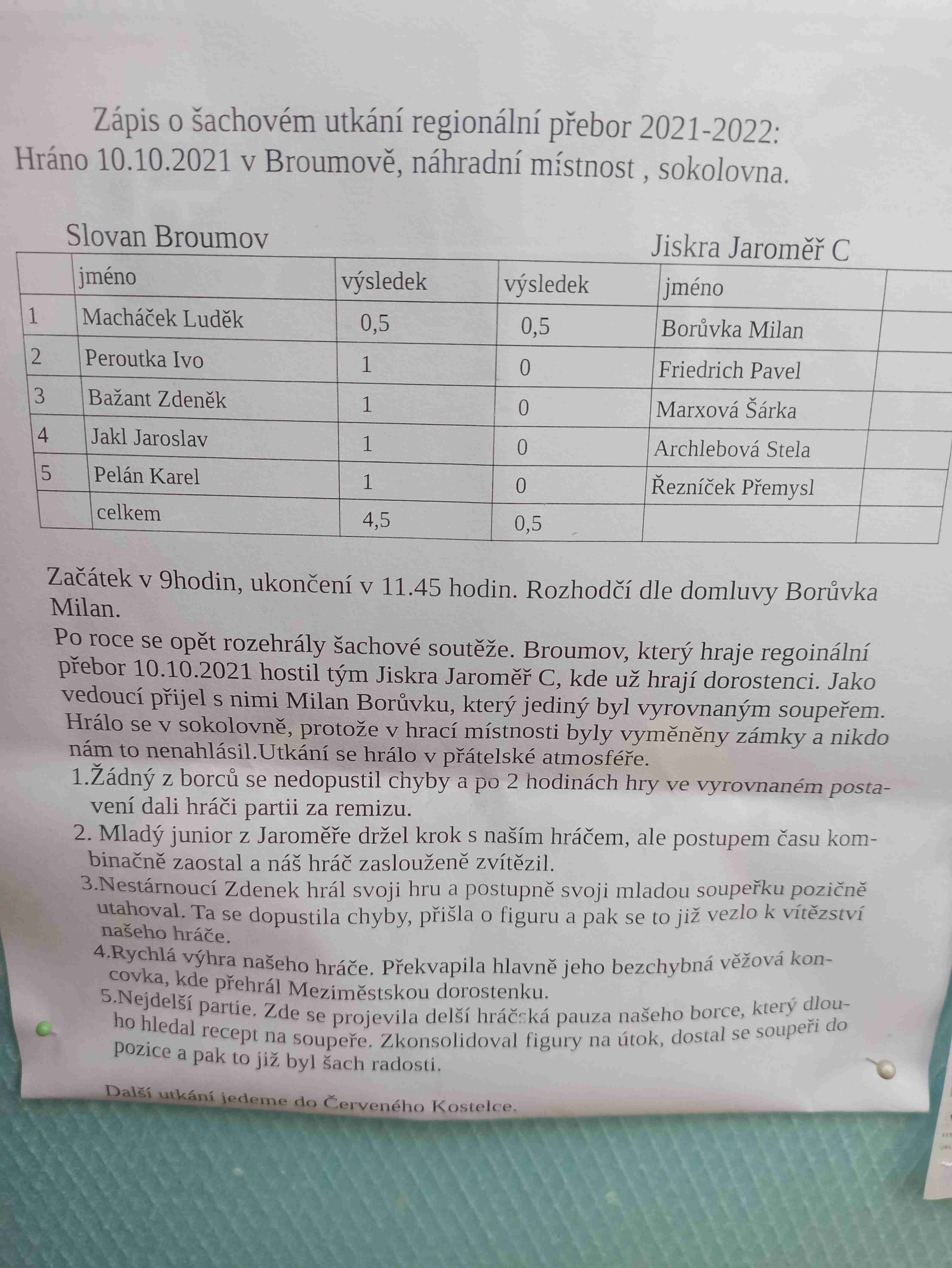 Reportáž nikdo z domácích nenapsal, ale při procházce po Broumově jsem narazil na aktuální šachovou vývěsku z pera pana Peroutky, kde je popsán průběh zápasu očima domácích: