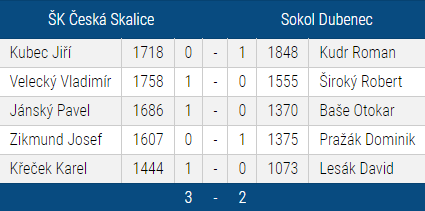 Naši hráči Roman Kudr a David Lesák nastupují jako hosté za tým Dubence. Reportáž, fotky a partie z utkání proti České Skalici, jednomu z favoritů soutěže, najdete na webu ˇŠachy v České Skalici", který vede Vladimír Velecký.