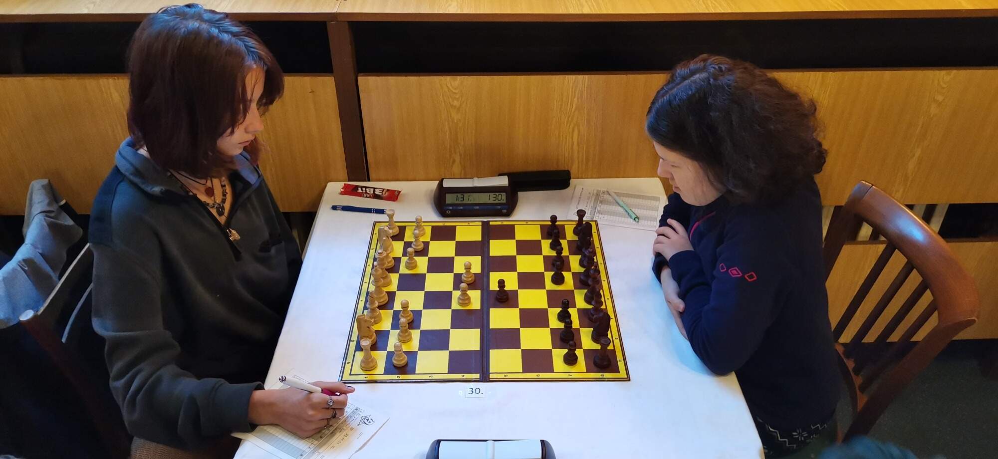 Na čtvrtek bylo naplánované dvojkolo. To ranní jsem hrála s Dolanskou Ester z TJ Bohemians Praha. Ve střední hře udělala chybu, kde soupeřka získala pěšce a poté už měla převahu. Takže jsem nakonec prohrála. Stela, Iva i Eva rovněž prohrály.