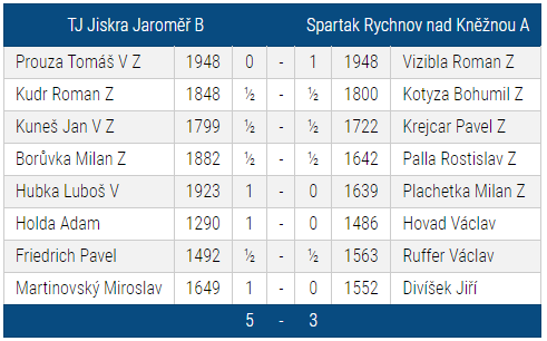 V neděli 7. 11. 2021 si naše B-družstvo odbylo premiéru v nové hrací místnosti v 2. kole KS proti Spartaku Rychnov. Vzhledem k úzké soupisce Rychnova bylo téměř jasné, kdo ze soupeřů nastoupí. V zápase jsme poměrně rychle vedli 2:0 po rychlé výhře Adama Holdy, který se v poslední době velmi zlepšil a Luboše Hubky. Následovaly dvě remízy. Honza Kuneš ve vyrovnané pozici remizoval s Pavlem Krejcarem a já (Milan Borůvka) jsem přijal remízu s Rosťou Pallou už v pozici, která se mi už moc nelíbila. Musel bych čekat bez jakékoliv protihry jestli přežiju Rosťův útok nebo ne. Na 3,5:1,5 opakováním tahů ve střední hře upravil Pavel Friedrich, aby vzápětí na zisk 3 zápasových bodů zvýšil Mirek Martinovský. Mirek mohl asi vyhrát rychleji, ale asi na oběd nespěchal a chtěl si partii užít. Dohrávaly se poslední dvě partie, jejichž výsledek už na naší zápasové výhře nemohl nic změnit. Romanovi Kudrovi obětoval Bohouš Kotyza figuru za nějakého toho pěšáka. Bohoušovi se však nepodařilo pěšce rozpohybovat, především díky aktivitě Romanových figurek. Zajímavá partie! Jako poslední dohrával na 1. šachovnici Tomáš Prouza s Romanem Viziblou. Partie byla dlouho v rovnováze, ale černý měl v závěru na vrch. Tomáš zakončil partii ztrátou figury a partii vzdal.