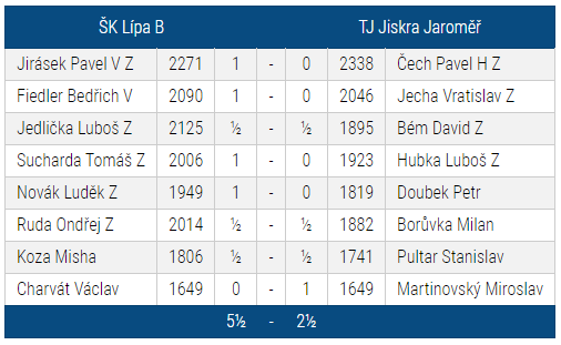 2,5: 5,5 je poslední slušná prohra. Upřímně, na víc jsme neměli. Jednu chvíli to vypadalo i na větší porážku. V žádné partii jsme neměli převahu a soupeř vyhrál zcela zaslouženě. Jak to bude s dalšími zápasy nikdo neví. Uvidíme.