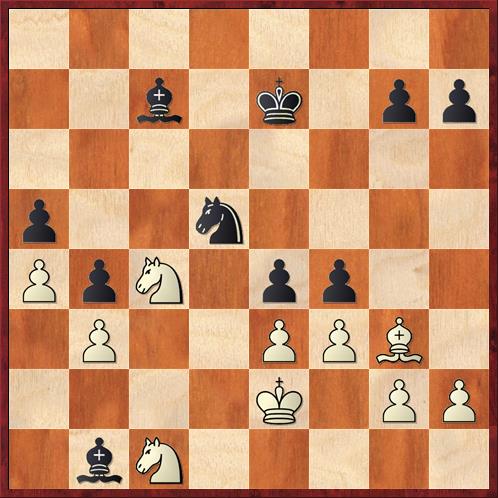 Dohrával jsem (Pavel) poslední, zato jsem vyhrál hned dvakrát! Už před 20. tahem jsem stál nádherně, ale nic konkrétního jsem nenašel a přešel do koncovky lehkých figur s tím, že dva střelci už něco vymyslí. Musel jsem nakonec vymýšlet sám, po 38...f4 (viz třetí diagram) to soupeř konečně zkazil.