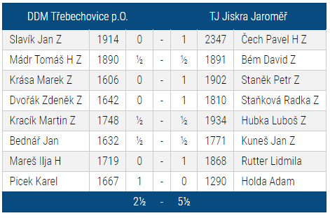 Za stavu 3,5:1,5 téměř současně remizovali David Bém na druhé a Luboš Hubka na páté šachovnici.