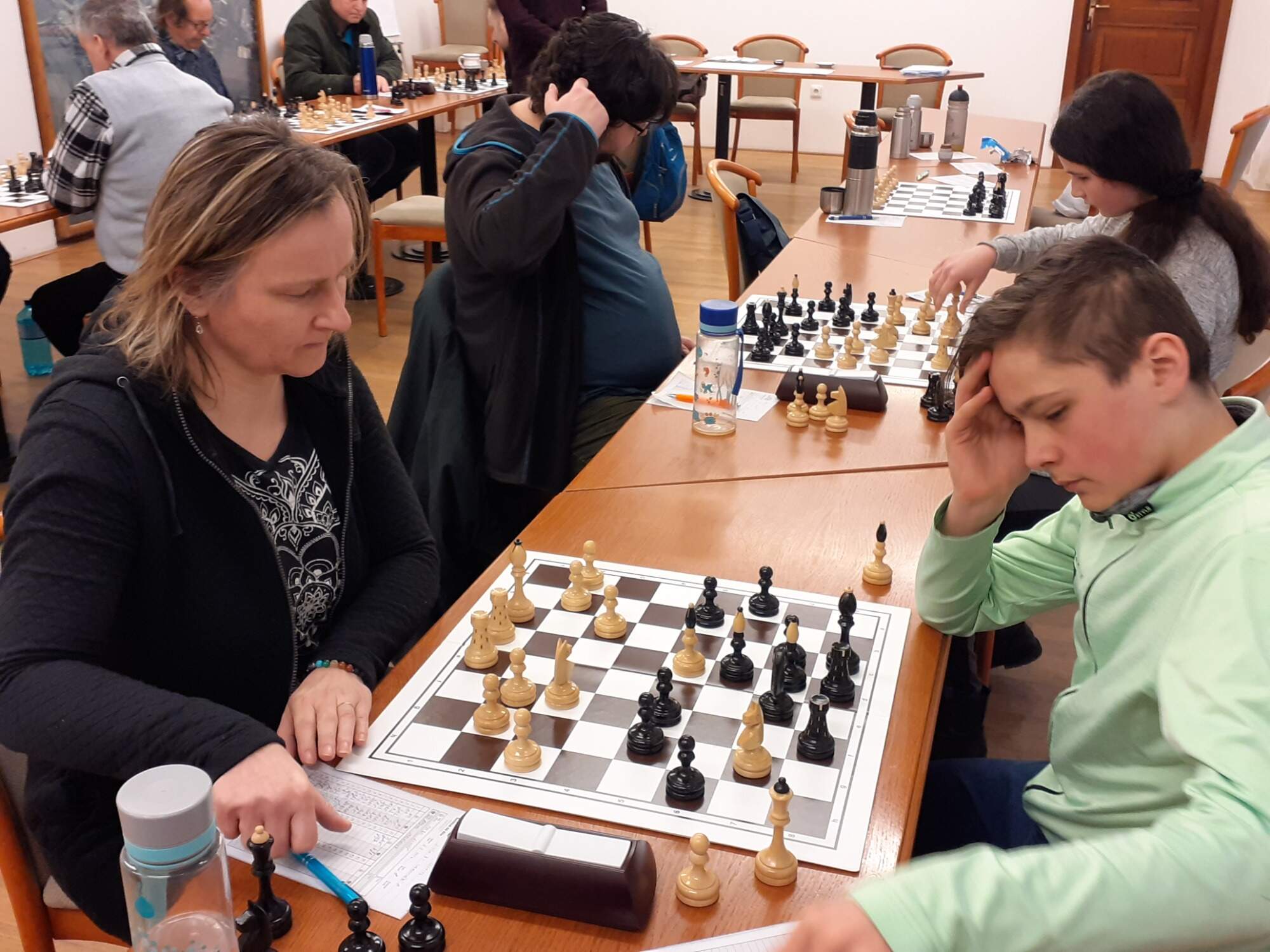 Na třetí a čtvrté šachovnici nastoupili zajímavé dvojice, na jedné straně manželé Staňkovi (za nás) a sourozenci Zelbovi ( za soupeře). Zde se odehrávalo závěrečné drama utkání se šťastným koncem pro nás. Radka Staňková stála skvěle. Pak asi něco špatně spočítala nebo přehlédla (sežrala otráveného pěšce), prostě v koncovce věží a lehkých figur ji jedna figurka chyběla, což se jí i při její pověstné bojovnosti už nepodařilo dohnat a soupeř (Lukáš Zelba) s přehledem zrealizoval svou materiální převahu.