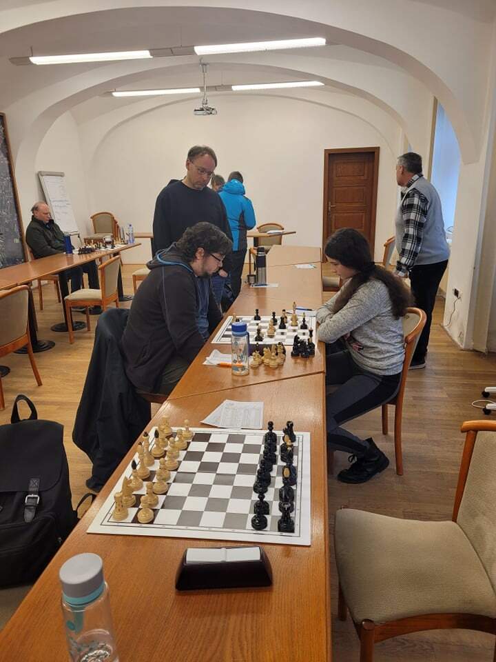 Na osmé šachovnici nás v přeboru po krátké přestávce doplnil Milan Borůvka, který sehrál s mladou soupeřkou Ivou Petirovou zavřenou variantu sicilské obrany. Soupeřka při zvolené pěšcové výstavbě c5-d6-e5 nešikovně postavila svého jezdce na d7 místo c6, kde jeho perspektivy nejsou velké. Milan vyhrál díky vazbě černé dámy, kdy mohl soupeřce odebrat zdarma střelce na e5. Spolehlivý výkon našeho borce!