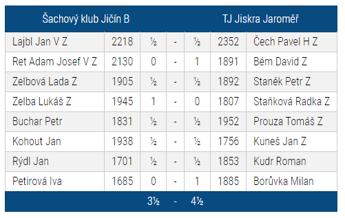 V neděli 6. 2. 2022 jsme zajížděli na utkání 8. kola Krajského přeboru do Jičína, města pohádky. Při vstupu do hrací místnosti nás přišel uvítat starý známý, kamarád Honza Kohout a po krátké obligátní předzápasové rozpravě obě družstva zasedla k utkání. Tentokrát jsem dohrál mezi prvními, což u mě nebývá zvykem, a tak mi připadl úkol napsat k zápasu krátké ohlédnutí.