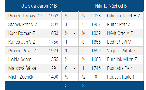 Remízu přijal na trojce Roman Kudr s Otto Nývltem. Ačkoli měl v závěrečné pozici figuru navíc, byl tak zablokovaný, že to snad ani nešlo vyhrát. Důležitý půlbod. 3,5-2,5