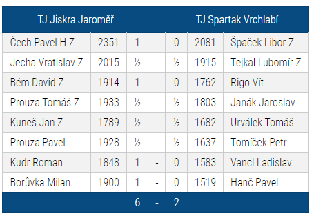 Pak dorazil soupeř. Asi před 3 lety jsem v reportáži citoval slavnou větu z filmu Forrest Gump (trochu upravenou): "Vrchlabí je jako bonboniéra, nikdy nevíš, v jaké sestavě přijede." Kdyby tento tým nastupoval "v plné síle", tak by se neztratil asi ani v druhé lize. Jenže často přední hráči Vrchlabí sehrají pouze několik partií a běžně hrají hráči z výrazně nižších pater soupisky. A upřímně, tentokrát se proti nám Vrchlabí opravdu "nesešlo". Ze základní osmičky hráli dva a na třetí šachovnici hrál až jedenáctý hráč soupisky. To nás určitě pasovalo do role favorita.