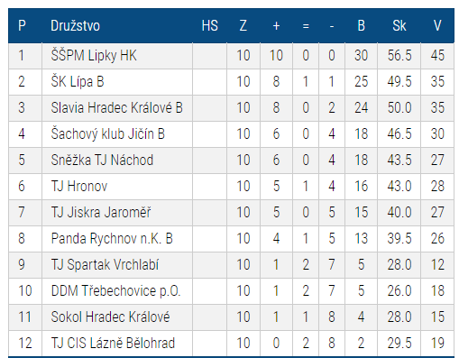 Pozn.: S analýzami mi výrazně pomohl počítač. Celkově tedy vysoké vítězství. Prakticky v žádné partii jsme nebyli výrazně ohroženi (snad jen Tomáš, ale to fakt bylo složité na propočet) a naše výhra mohla být i vyšší. V tabulce se ledacos vyjasnilo. Jistým vítězem a postupujícím do druhé ligy jsou mladíci z Lipek. Gratulujeme. O druhém a třetím místě se rozhodne mezi Slávií a Lípou. S poměrně velkým odstupem je pak pětice týmů (Jičín, Náchod, Hronov, Jaroměř a Rychnov). Tady se bojuje o střed tabulky a půjde i o to, kdo jakou bude mít motivaci. Dramatická situace je však na konci tabulky. Zatím není jasné, kolik týmů bude sestupovat. O tom rozhodne udržení nebo sestup Hořic ve druhé lize. Zatím poslední je Bělohrad, hraje ale v přímém souboji s Třebechovicemi. Pokud zvítězí, tak má i dobré skóre, které může nakonec rozhodovat. A opět může výsledky ovlivnit motivace soupeřů v posledním kole. Tož uvidíme.